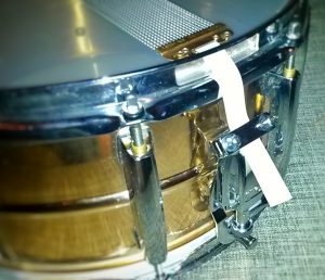 Wycinając mały pasek ze starego naciągu można zdziałać cuda w kwestii brzęczących sprężyn. Cienki paseczek (taki jak na zdjęciu) pomoże nieco zniwelować niechciany dźwięk. Dla lepszego efektu proponujemy zastosować grubszy pasek. Ten zabieg może być szczególnie użyteczny w studio, jeśli wystąpią problemy ze sprężynami odzywającymi się w mikrofonie. Ważne jest też umieszczenie paska- im bliżej środka, tym mniej brzęczenia, ale również mniej odzewu sprężyny. Nie warto przesadzać, ponieważ można wtedy otrzymać nieciekawy dźwięk.