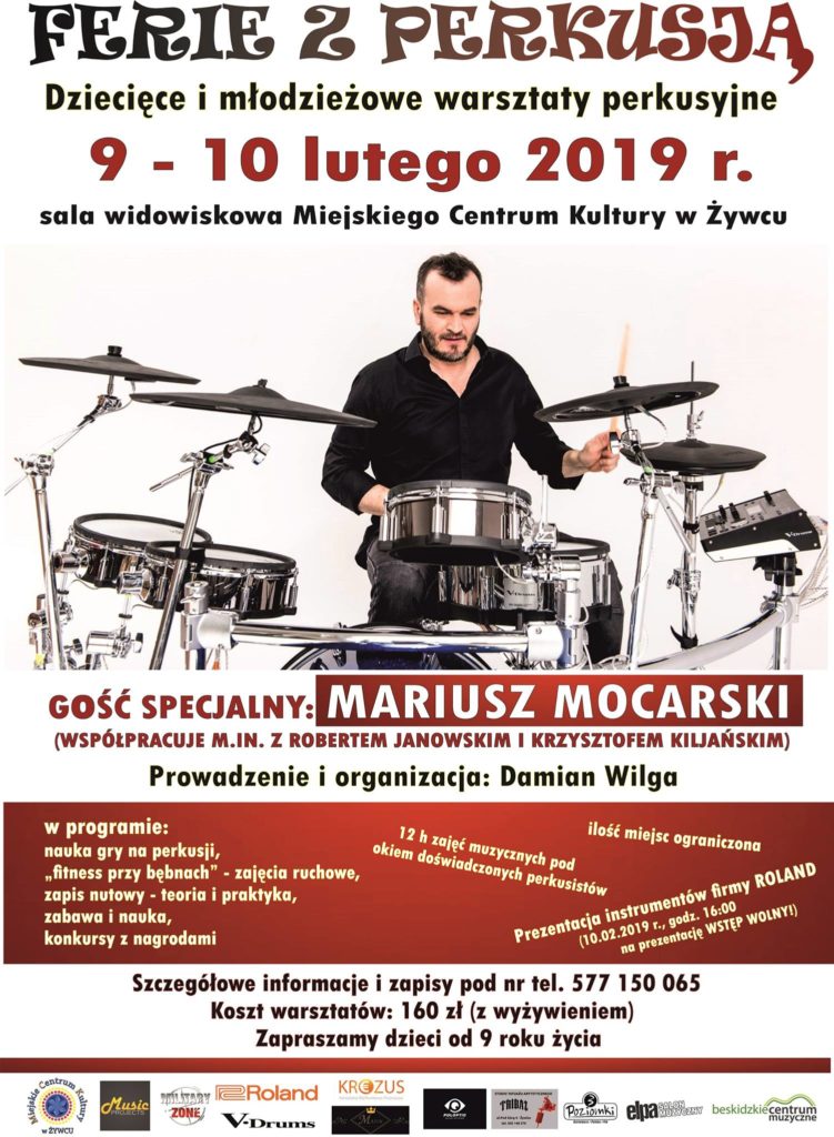 Zapraszamy wszystkich na Ferie Z Perkusją – dziecięce i młodzieżowe warsztaty perkusyjne, które odbędą się w sali widowiskowej Miejskiego Centrum Kultury w Żywcu w dniach 9-10 lutego 2019r.