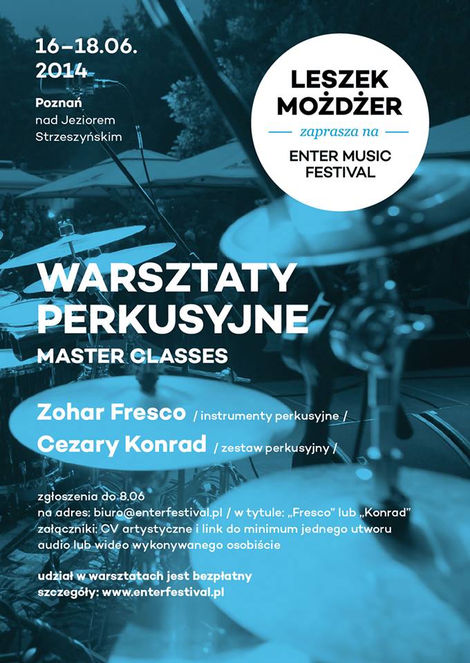 Już niebawem Poznań będzie gościł dwóch wspaniałych muzyków, którzy poprowadzą warsztaty perkusyjne. Będą to izraelski perkusista Zohar Fresco (znany z gry w trio Możdżer/Danielsson/Fresco oraz ze współpracy z Philipem Glassem), a także nasz perkusyjny as – Cezary Konrad. Impreza odbędzie się w dniach 16 – 18 czerwca 2014 r. nad Jeziorem Strzeszyńskim w ramach Enter music Festival.
