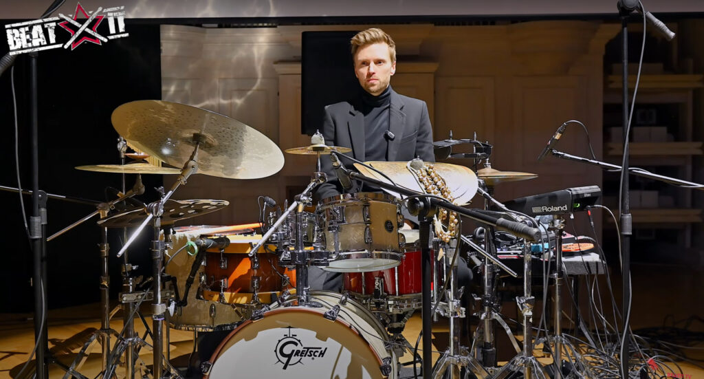 “Rdzeniem mojego zestawu jest zestaw Gretsch Renown Vintage Pearl w wymiarach 20″, 10″, 14″. Jest jeszcze tom 12″, który czeka w salce. Na jungle snare mam stale zapięty delay, żeby sypał się jak takie perły przy szybkiej frazie. Tutaj mam Pearl Anarchy Crusher, do którego jest doczepiony trigger, który ma bardzo duży reverb załączony na stałe. Jeśli uderzę w niego, to mam taką fajną smugę syku, więc mogę go używać jak elektronicznego clapa. Tutaj mamy Rolanda SPD-S, który jest mózgiem operacji triggerowych oraz brzmień AI. Tutaj jest stary, niezastąpiony Kaoss Pad (marki Korg – przyp. BeatIt), który daje świetny koloryt, ponieważ mogę zapiąć mu fajny preset i jedną ręką rysować różnego rodzaju delay’e, a drugą grać. Można uzyskać różnego rodzaju modulacje brzmień perkusyjnych. Jeśli chodzi o talerze, to ciekawym, naszym, krajowym wyrobem jest Kmicic. Bardzo ciekawa blaszka. Ma swoją specyfikę – taki crashowo-chinowy wydźwięk, ale też dużo fajnego “cyknięcia”.”