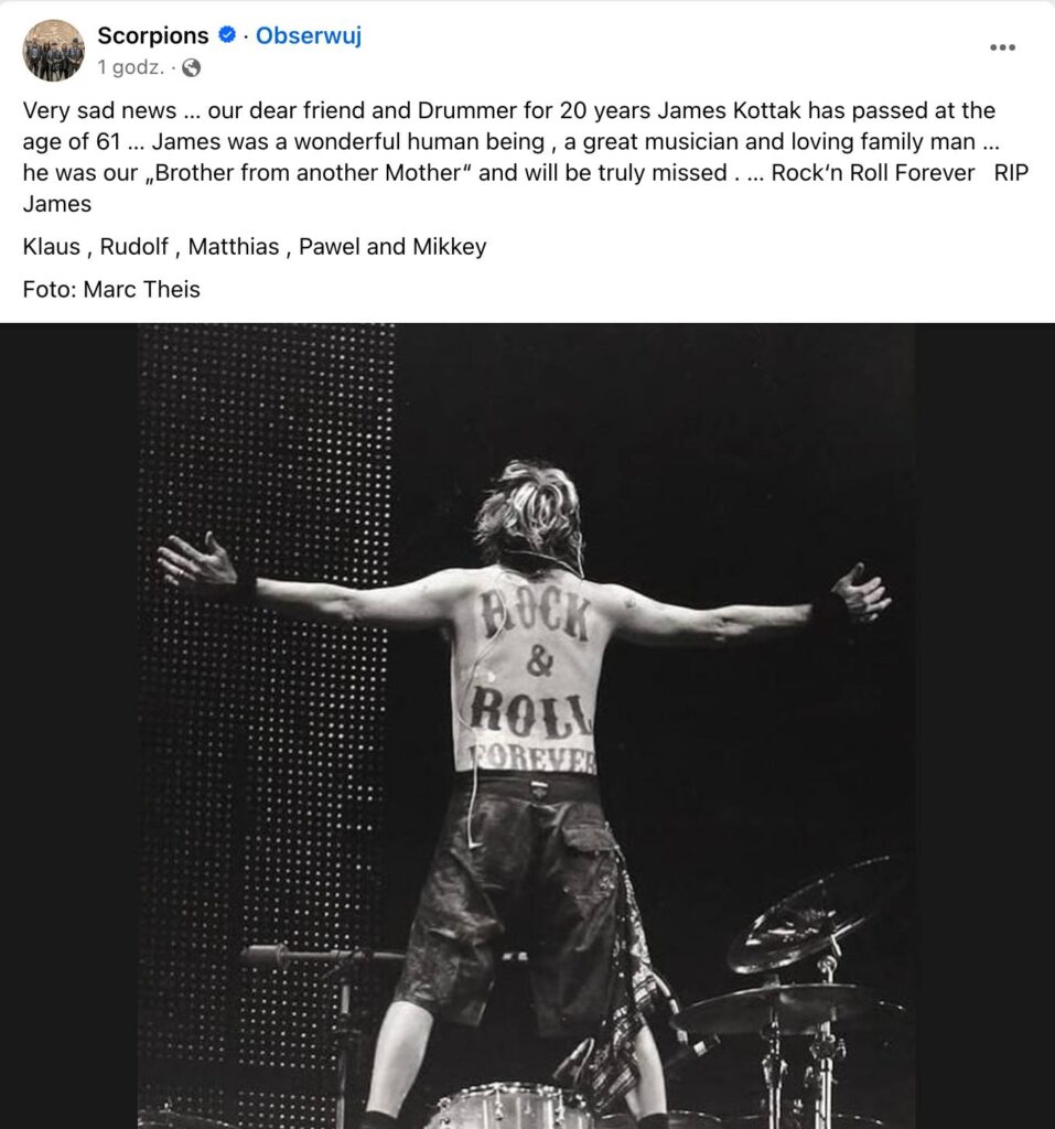 “Bardzo smutna wiadomość… Nasz drogi przyjaciel i perkusista przez 20 lat – James Kottak – zmarł w wieku 61 lat… James był wspaniałym człowiekiem, doskonałym muzykiem i kochającym ojcem rodziny… Był naszym „bratem z innej matki“ i będzie nam Go bardzo brakowało. Rock‘n Roll Forever. RIP James