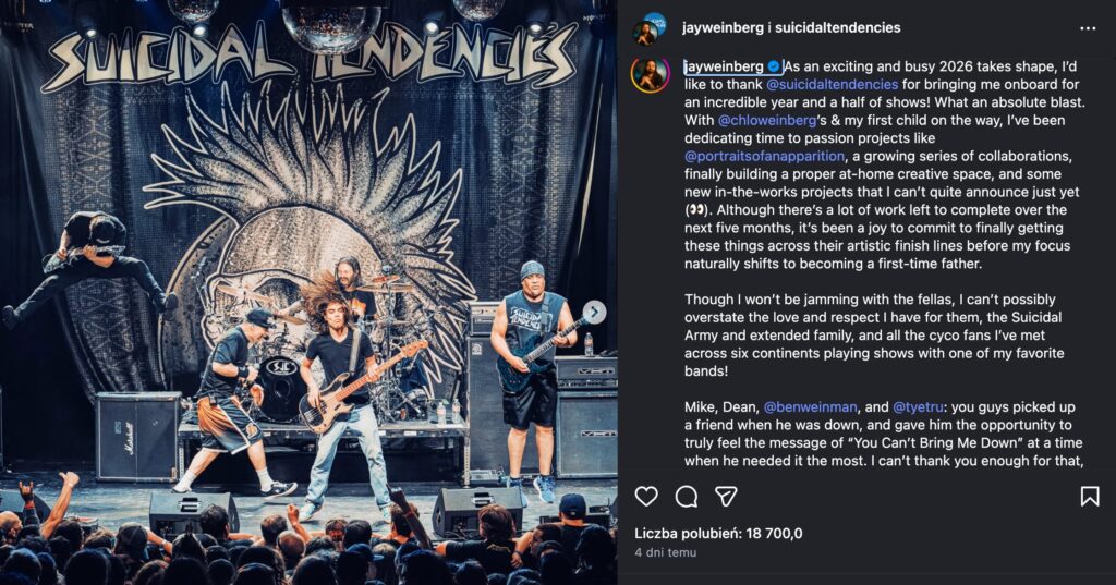 “Podczas gdy ekscytujący i pracowity rok 2026 nabiera kształtów, chciałbym podziękować Suicidal Tendencies za zabranie mnie na pokład na niesamowite półtora roku występów! Co za absolutny odlot. Z Chloe Weinberg i moim pierwszym dzieckiem w drodze, poświęcam czas na pasjonujące projekty, takie jak Portraits Of An Apparition, rosnącą serię kolaboracji, w końcu budując odpowiednią przestrzeń twórczą w domu i kilka nowych projektów, których jeszcze nie mogę ogłosić.