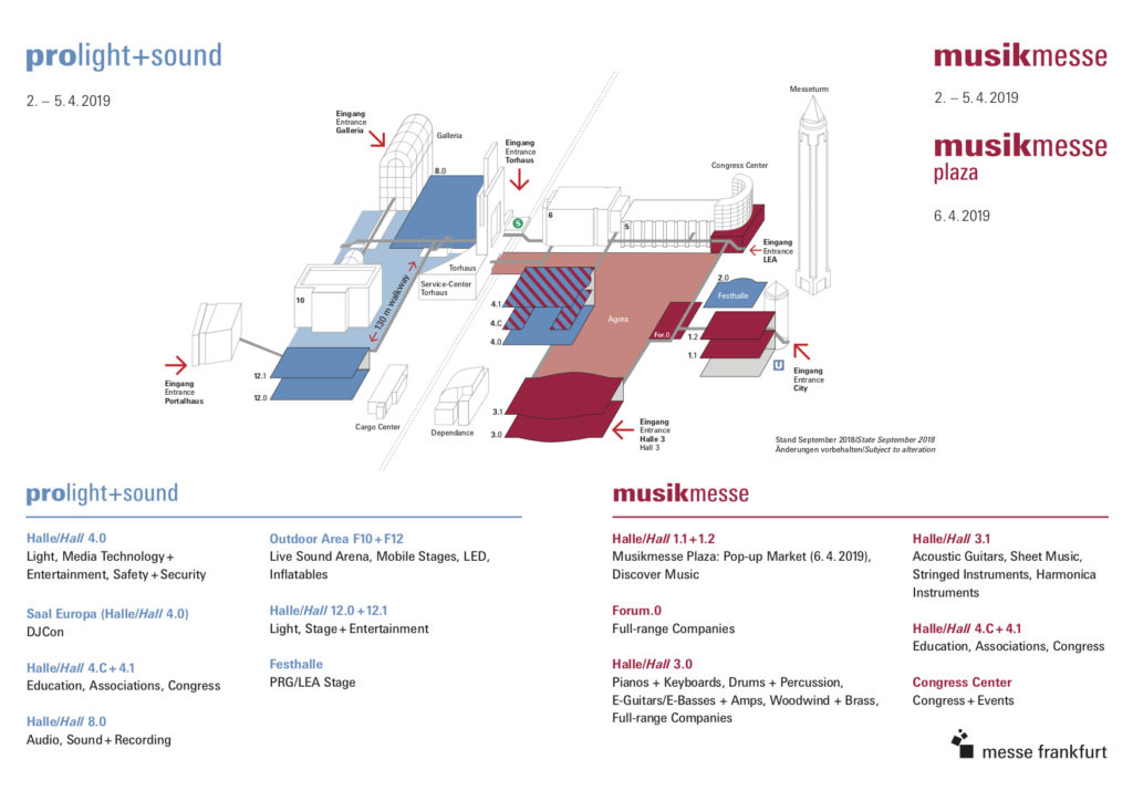 Po raz pierwszy wszystkie sprzęty audio będą zgromadzone w jednej hali wystawowej. Na powierzchni bliskiej 30 000 m² w hali 8.0, odwiedzający będą obracać się wokół systemów nagłośnieniowych, instalacji stałych, studia i nagrań. Otwarta we wrześniu 2018 roku Hala 12 jest optymalnym miejscem do prezentacji oświetlenia, sprzętu scenicznego, technologii rozrywkowej oraz systemów bezpieczeństwa i ochrony zdarzeń. Hala nr 4 skupia stowarzyszenia branży muzycznej i eventowej i jest siedzibą wspólną dla obu targów. Tam wystawcy Prolight + Sound mają również możliwość prezentacji w sercu Centrum Targowego. Hale 3.0 i 3.1 przedstawiają świat instrumentów klawiszowych, perkusyjnych, szarpanych, instrumentów smyczkowych i instrumentów dętych, a także nut i sprzętu. Dopełnieniem układu hal jest Forum.0 dla firm z pełną ofertą oraz Centrum Kongresowe z programem do nauki muzycznej.