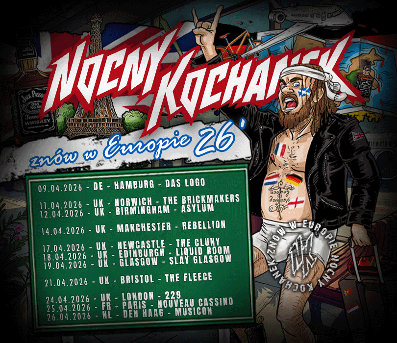 Po niezwykle intensywnym jubileuszowym roku oraz wydaniu płyty i filmu „Urwany film”, a także kompilacji “As w nogawce” (pisaliśmy o tym TUTAJ) Nocny Kochanek nie zwalnia tempa. W kwietniu 2026 r. zespół wyruszy w kolejną trasę koncertową – tym razem obejmującą kluby w kilku europejskich krajach. Na koncertowej mapie znalazły się Niemcy, Wielka Brytania, Francja oraz Holandia. W sumie zaplanowano jedenaście koncertów, podczas których publiczność usłyszy przekrojowy materiał z całej historii zespołu. Na scenie obok Nocnego Kochanka pojawią się również zespoły Over The Under oraz Sick Saints.