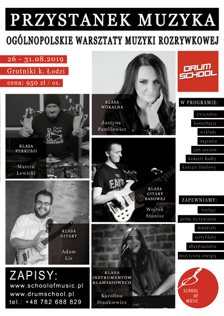Impreza odbędzie się w dniach 26 – 31 Sierpnia 2019 w okolicach Łodzi (Grotniki). Warsztaty kierowane są dla osób na każdym poziomie zaawansowania, które chciałyby spędzić tydzień z codziennymi ćwiczeniami oraz doskonaleniem technik gry na instrumencie lub śpiewu. Ten muzyczny obóz obejmuje śpiew, perkusję, gitarę, gitarę basową oraz instrumenty klawiszowe, a wykładowcami będą kolejno: Justyna Panfilewicz, Marcin Lewicki, Adam Lis, Wojtek Stanisz oraz Karolina Stankiewicz. Organizatorami campu są Drum School oraz School of Music.