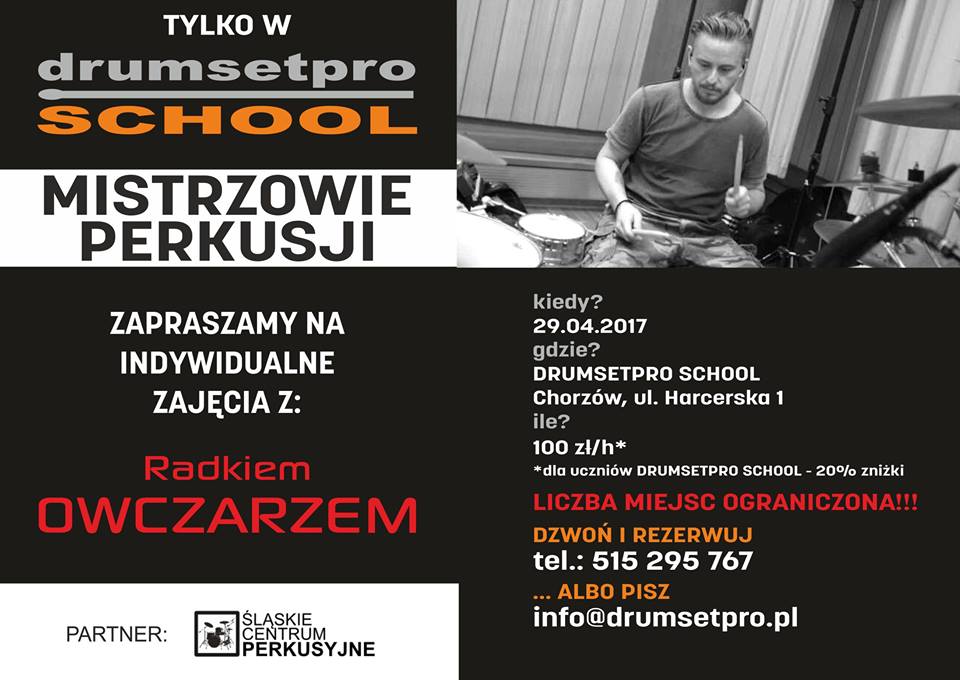 Już za tydzień odbędą się tam indywidualne zajęcia z czołowym polskim perkusistą sesyjnym i koncertowym – Radkiem Owczarzem. Tysiące godzin spędzonych w studio i na estradzie olbrzymie doświadczenie i ciekawa osobowość. To wszystko czeka każdego, kto na taką lekcję się zdecyduje.