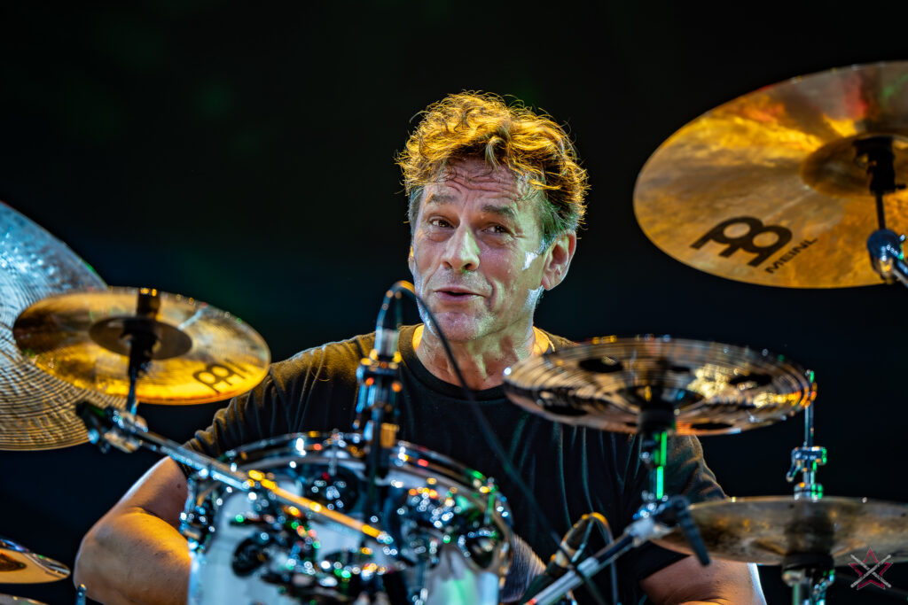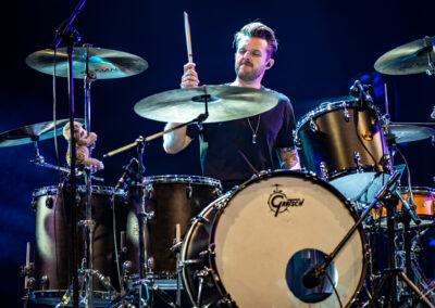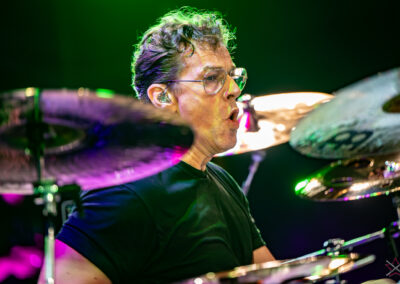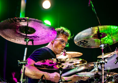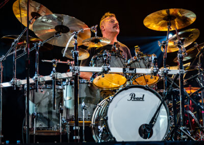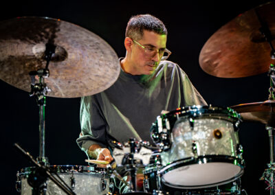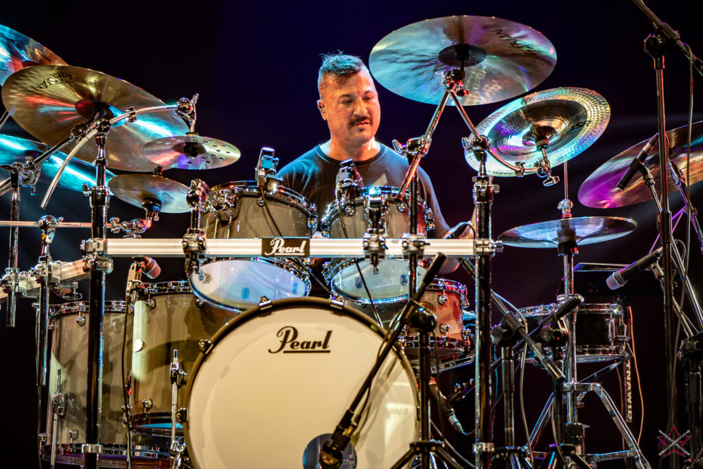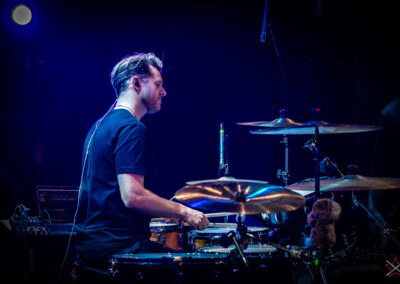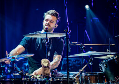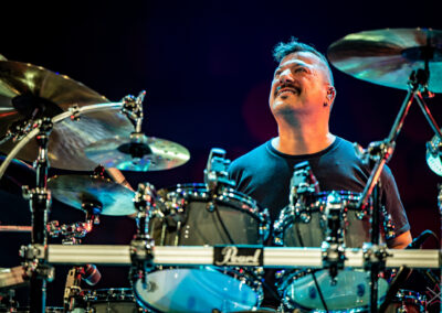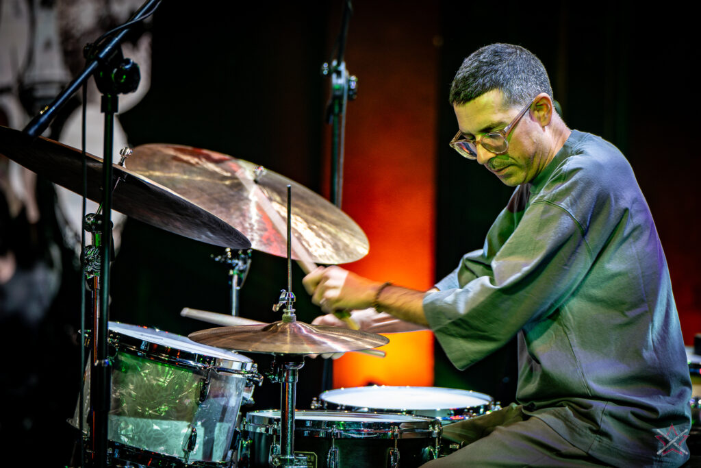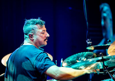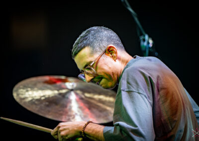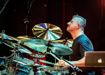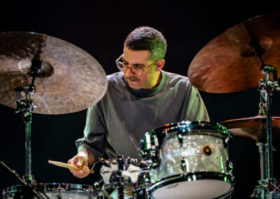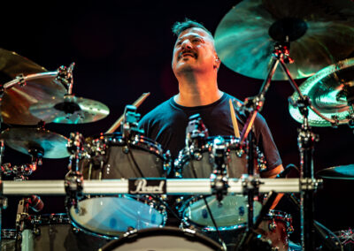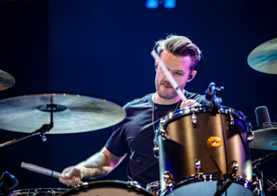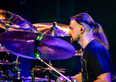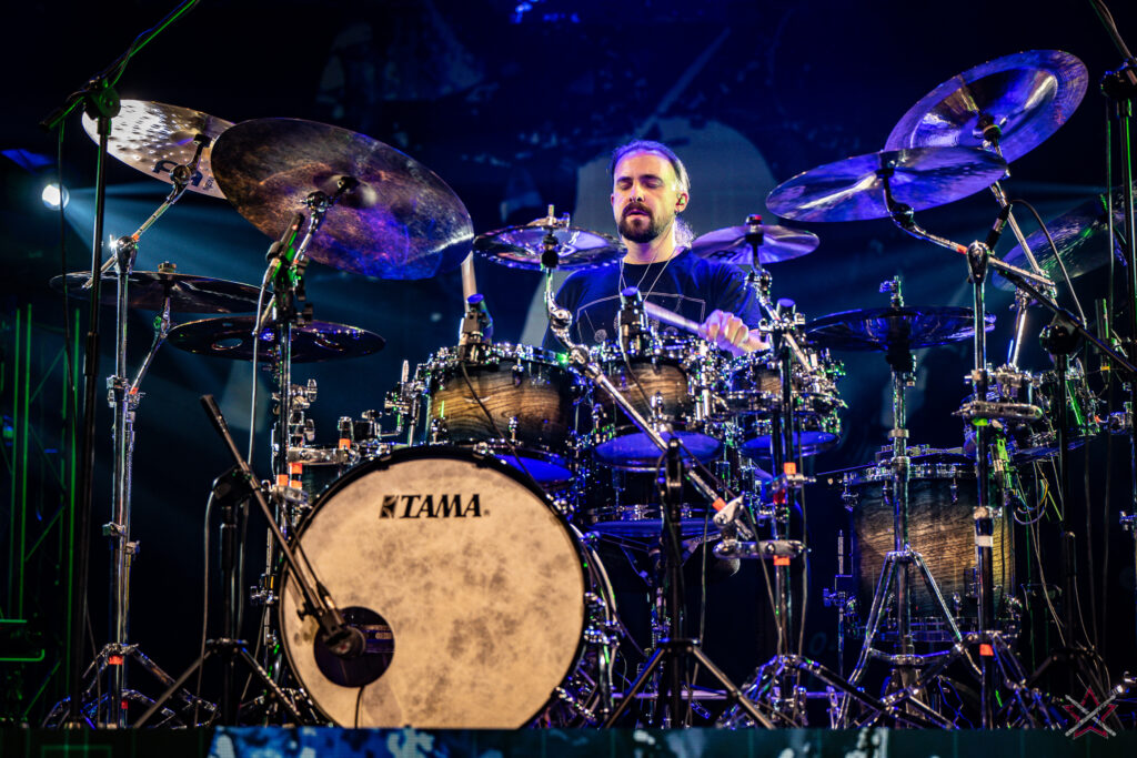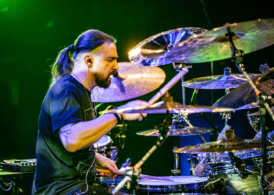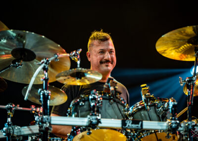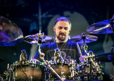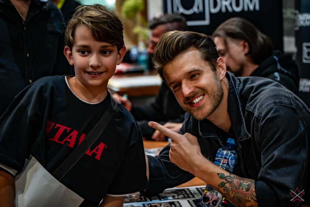 to już prawdziwa gwiazda w świecie bębnów. Dało się odczuć, że jest jedną z głównych atrakcji imprezy oraz że publiczność czekała na spotkanie z nim. Zaczął od hitu “Freestyler” Bomfunk MC’s sprzed 26 lat i była to jazda na najwyższych obrotach – pojawiły się elementy jungle, break beaty, a nawet blasty. Kolejny podkład był czysto metalowy, więc wystrzeliło jeszcze więcej blastów granych z obu stron (oburęczność włoskiego mistrza jest doskonale znana) oraz wybuchowych przejść po całym zestawie, nie zabrakło także precyzyjnej gry na dwie stopy. W improwizowanej części występu artysta dorzucił świetny moment gry open-handed i kolejny doskonały popis gry nogami. Na osobną wzmiankę zasługuje świetna prezentacja techniki rąk, jaką Riccardo przeprowadził w odpowiedzi na pytanie o to, jak doszedł do takiego tempa gry. W jasny i spójny sposób opisał i pokazał, na czym to polega, bez owijania w bawełnę po to, aby zazdrośnie “strzec” swojej “tajemnicy”. Przecież i tak każdy musi, nomen omen, odbębnić swoje przysłowiowe 10 tys. godzin 😉