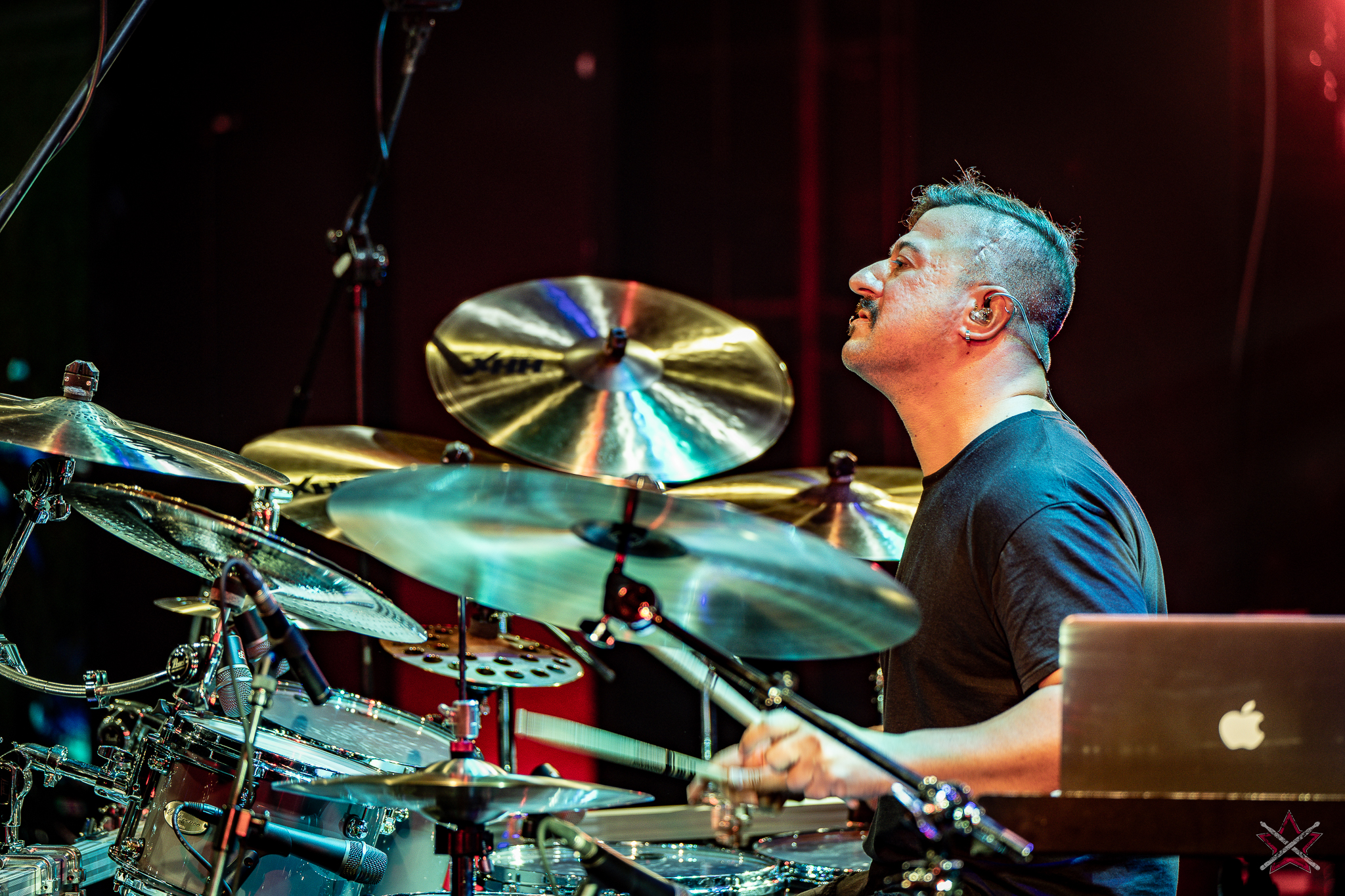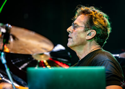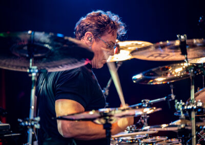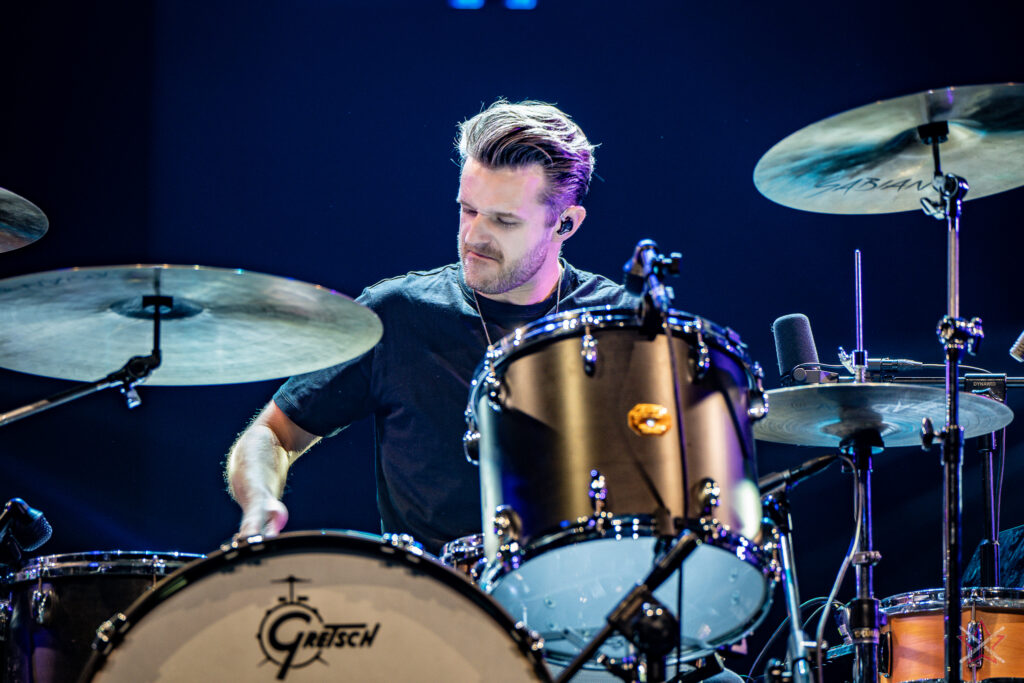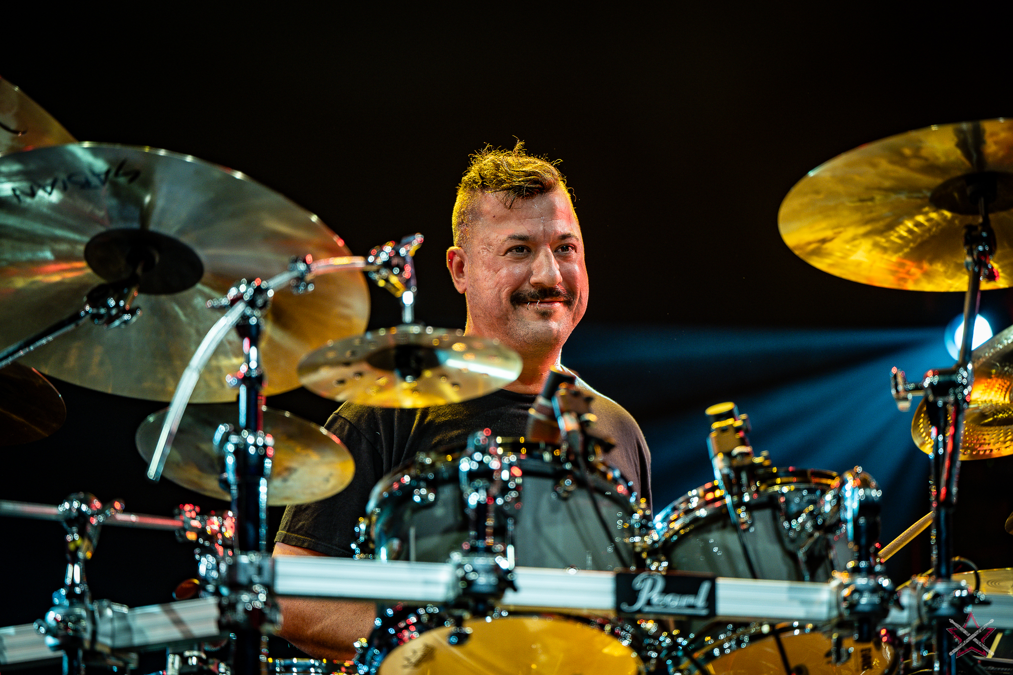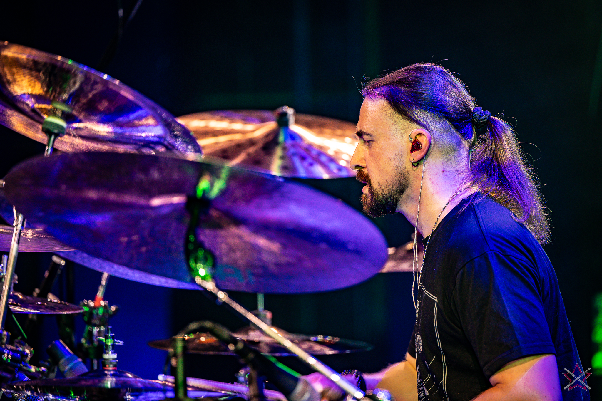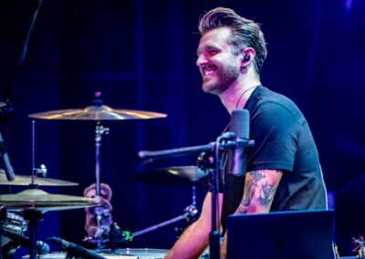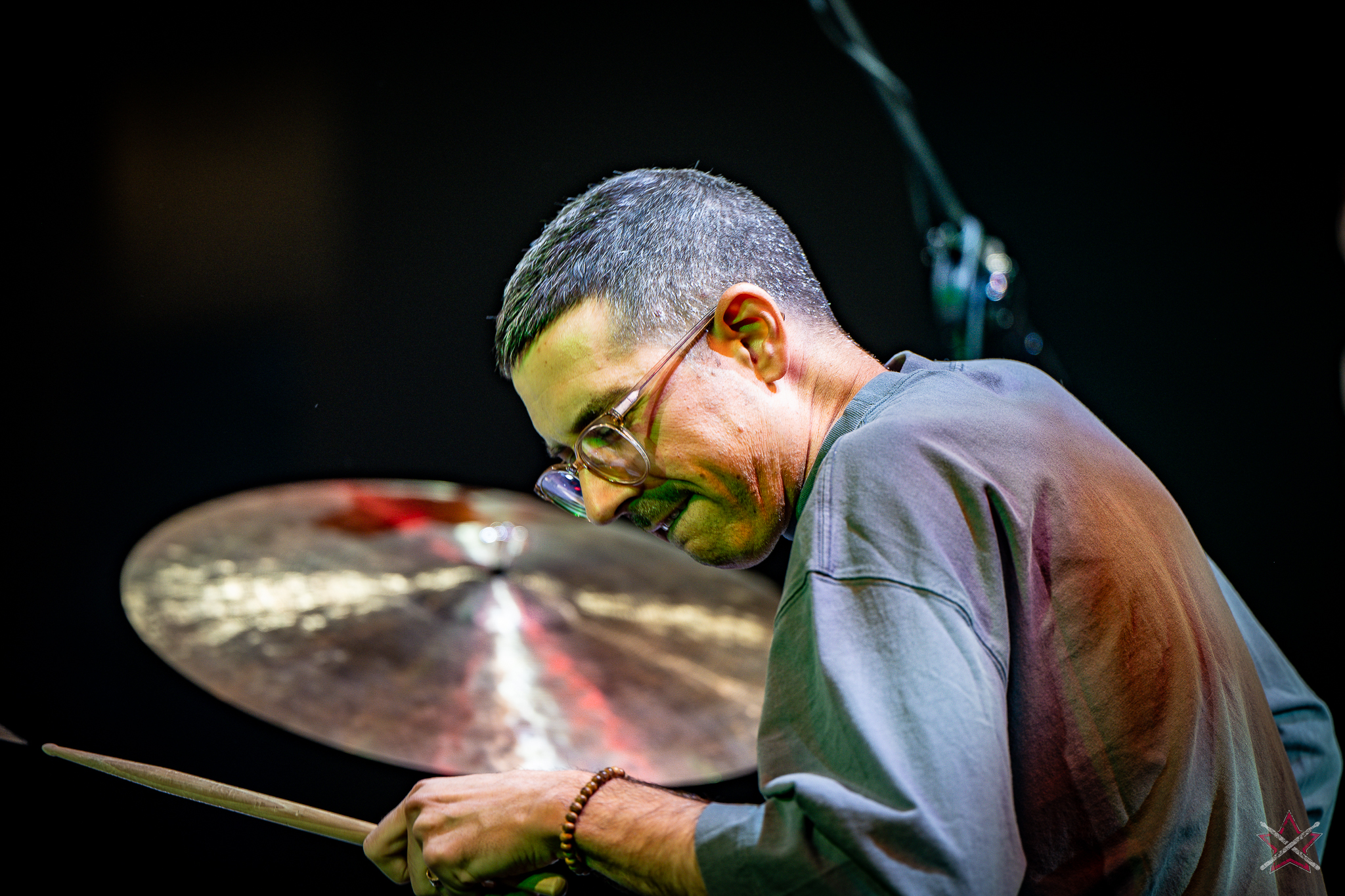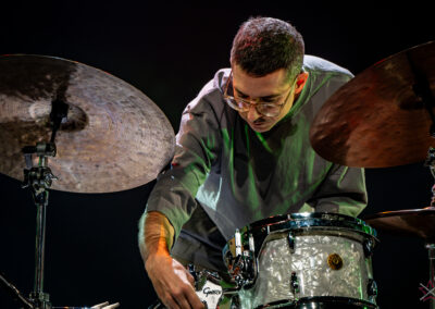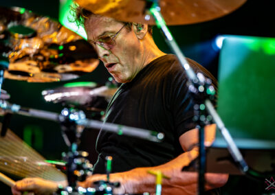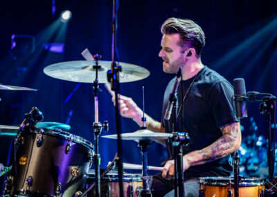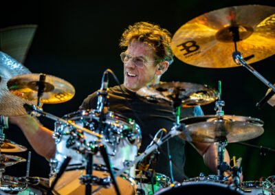 to już prawdziwa gwiazda w świecie bębnów. Dało się odczuć, że jest jedną z głównych atrakcji imprezy oraz że publiczność czekała na spotkanie z nim. Zaczął od hitu “Freestyler” Bomfunk MC’s sprzed 26 lat i była to jazda na najwyższych obrotach – pojawiły się elementy jungle, break beaty, a nawet blasty. Kolejny podkład był czysto metalowy, więc wystrzeliło jeszcze więcej blastów granych z obu stron (oburęczność włoskiego mistrza jest doskonale znana) oraz wybuchowych przejść po całym zestawie, nie zabrakło także precyzyjnej gry na dwie stopy. W improwizowanej części występu artysta dorzucił świetny moment gry open-handed i kolejny doskonały popis gry nogami. Na osobną wzmiankę zasługuje świetna prezentacja techniki rąk, jaką Riccardo przeprowadził w odpowiedzi na pytanie o to, jak doszedł do takiego tempa gry. W jasny i spójny sposób opisał i pokazał, na czym to polega, bez owijania w bawełnę po to, aby zazdrośnie “strzec” swojej “tajemnicy”. Przecież i tak każdy musi, nomen omen, odbębnić swoje przysłowiowe 10 tys. godzin 😉