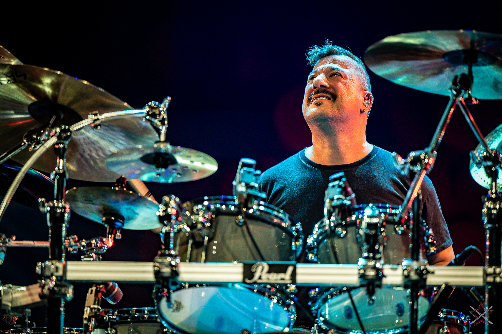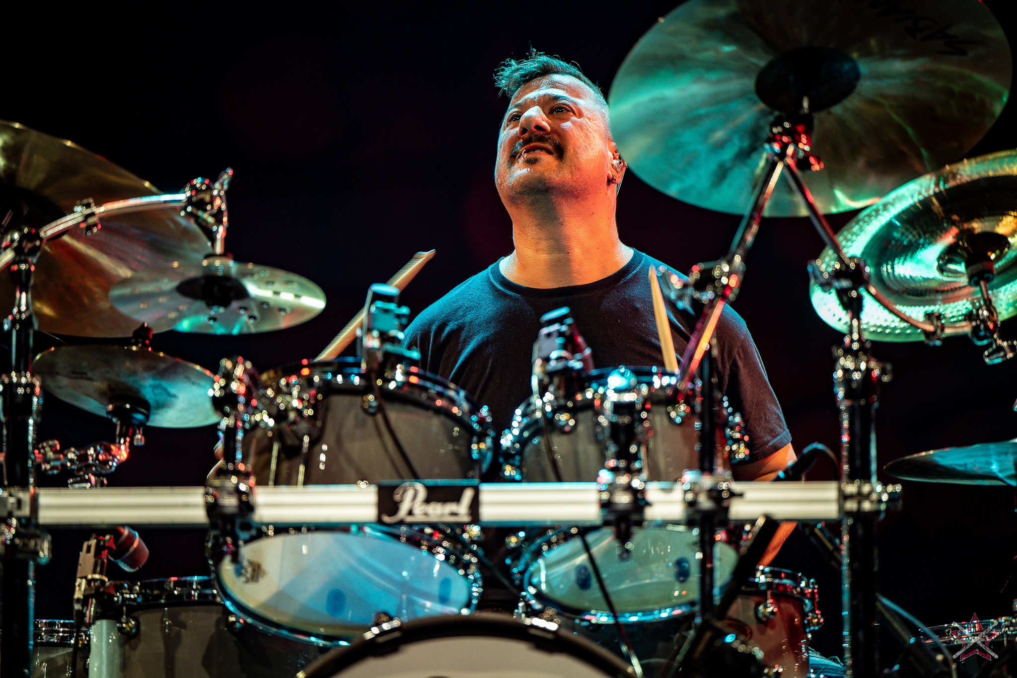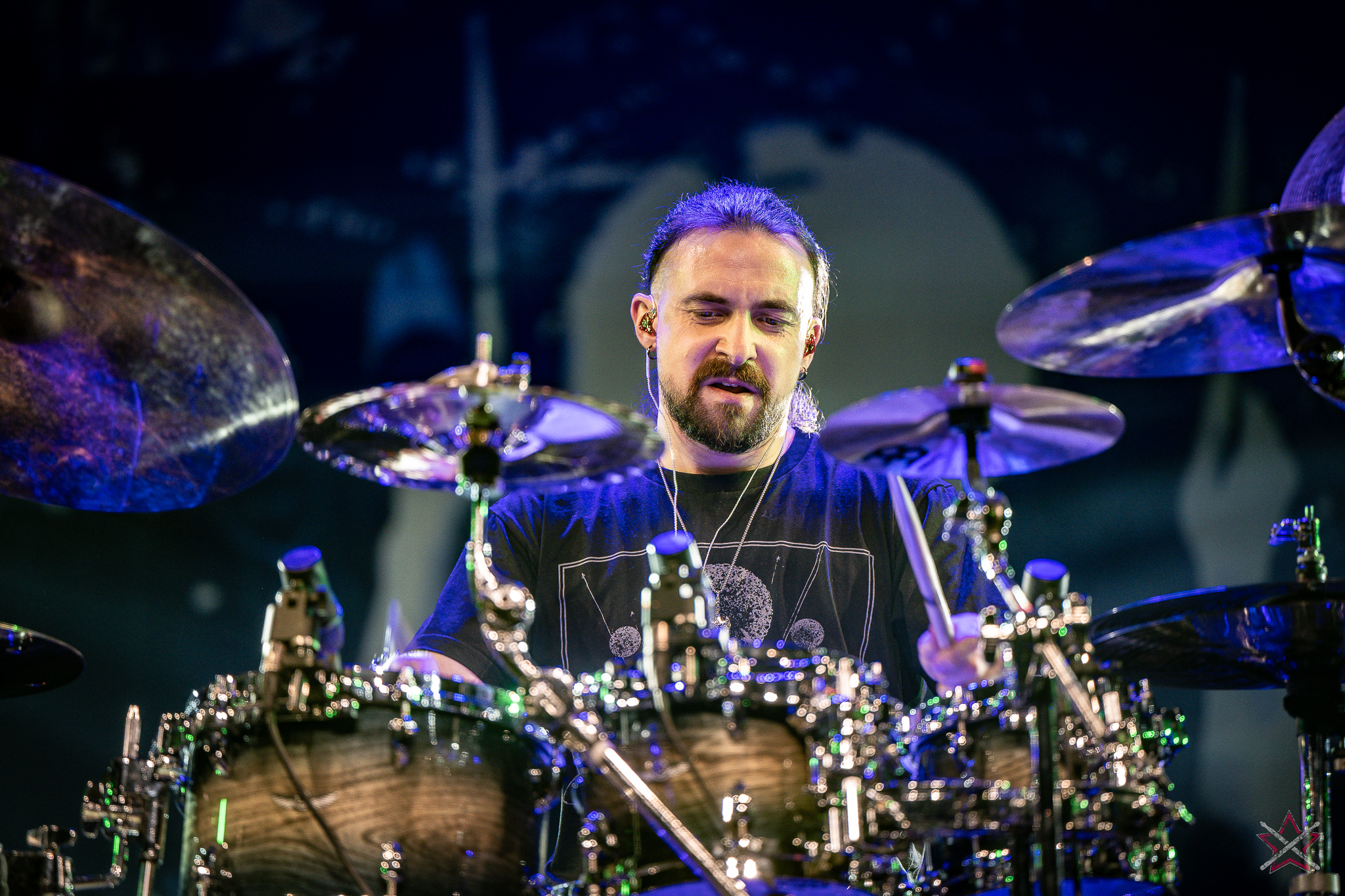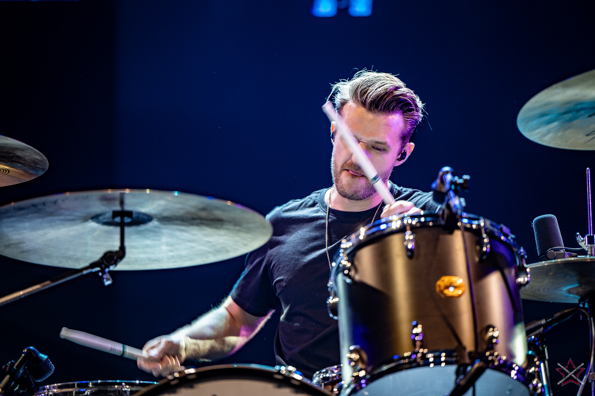 to już prawdziwa gwiazda w świecie bębnów. Dało się odczuć, że jest jedną z głównych atrakcji imprezy oraz że publiczność czekała na spotkanie z nim. Zaczął od hitu “Freestyler” Bomfunk MC’s sprzed 26 lat i była to jazda na najwyższych obrotach – pojawiły się elementy jungle, break beaty, a nawet blasty. Kolejny podkład był czysto metalowy, więc wystrzeliło jeszcze więcej blastów granych z obu stron (oburęczność włoskiego mistrza jest doskonale znana) oraz wybuchowych przejść po całym zestawie, nie zabrakło także precyzyjnej gry na dwie stopy. W improwizowanej części występu artysta dorzucił świetny moment gry open-handed i kolejny doskonały popis gry nogami. Na osobną wzmiankę zasługuje świetna prezentacja techniki rąk, jaką Riccardo przeprowadził w odpowiedzi na pytanie o to, jak doszedł do takiego tempa gry. W jasny i spójny sposób opisał i pokazał, na czym to polega, bez owijania w bawełnę po to, aby zazdrośnie “strzec” swojej “tajemnicy”. Przecież i tak każdy musi, nomen omen, odbębnić swoje przysłowiowe 10 tys. godzin 😉