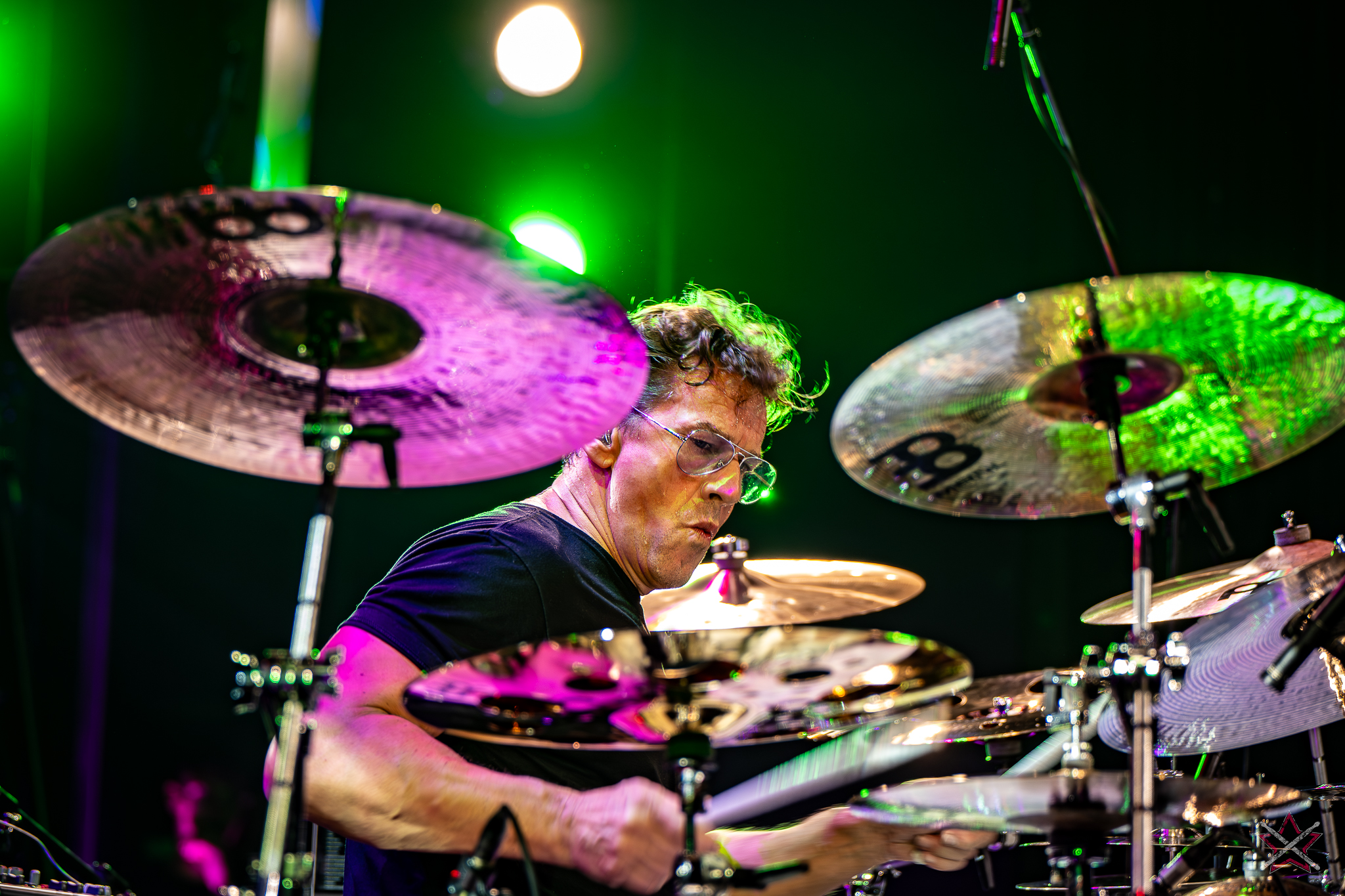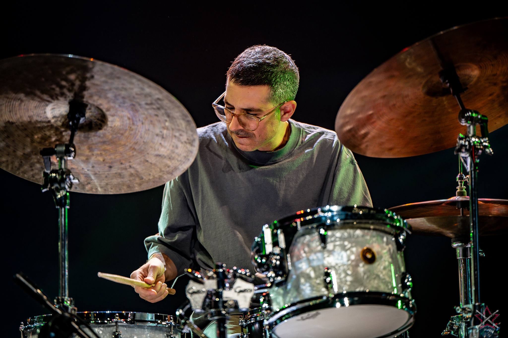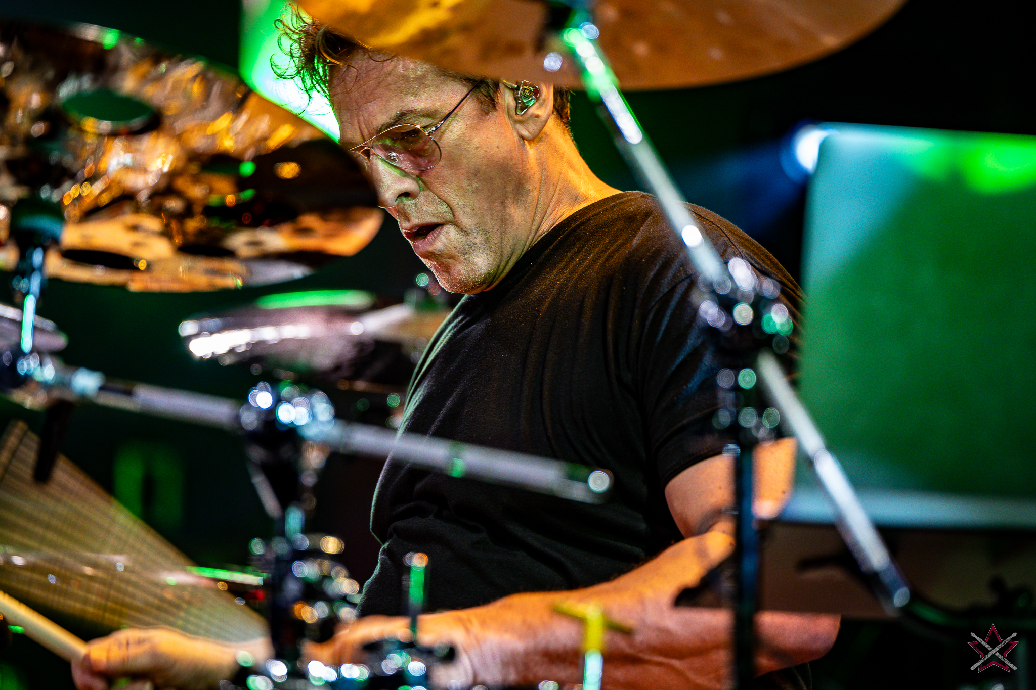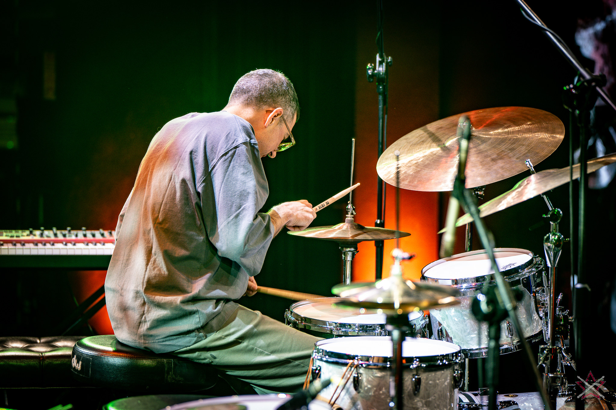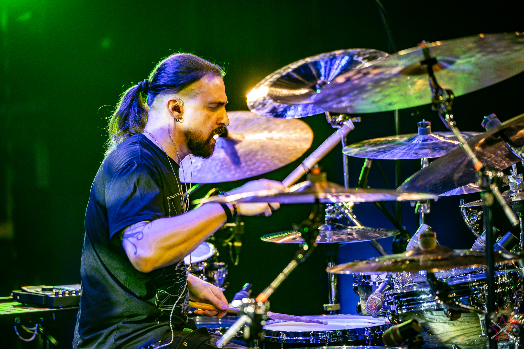 to już prawdziwa gwiazda w świecie bębnów. Dało się odczuć, że jest jedną z głównych atrakcji imprezy oraz że publiczność czekała na spotkanie z nim. Zaczął od hitu “Freestyler” Bomfunk MC’s sprzed 26 lat i była to jazda na najwyższych obrotach – pojawiły się elementy jungle, break beaty, a nawet blasty. Kolejny podkład był czysto metalowy, więc wystrzeliło jeszcze więcej blastów granych z obu stron (oburęczność włoskiego mistrza jest doskonale znana) oraz wybuchowych przejść po całym zestawie, nie zabrakło także precyzyjnej gry na dwie stopy. W improwizowanej części występu artysta dorzucił świetny moment gry open-handed i kolejny doskonały popis gry nogami. Na osobną wzmiankę zasługuje świetna prezentacja techniki rąk, jaką Riccardo przeprowadził w odpowiedzi na pytanie o to, jak doszedł do takiego tempa gry. W jasny i spójny sposób opisał i pokazał, na czym to polega, bez owijania w bawełnę po to, aby zazdrośnie “strzec” swojej “tajemnicy”. Przecież i tak każdy musi, nomen omen, odbębnić swoje przysłowiowe 10 tys. godzin 😉