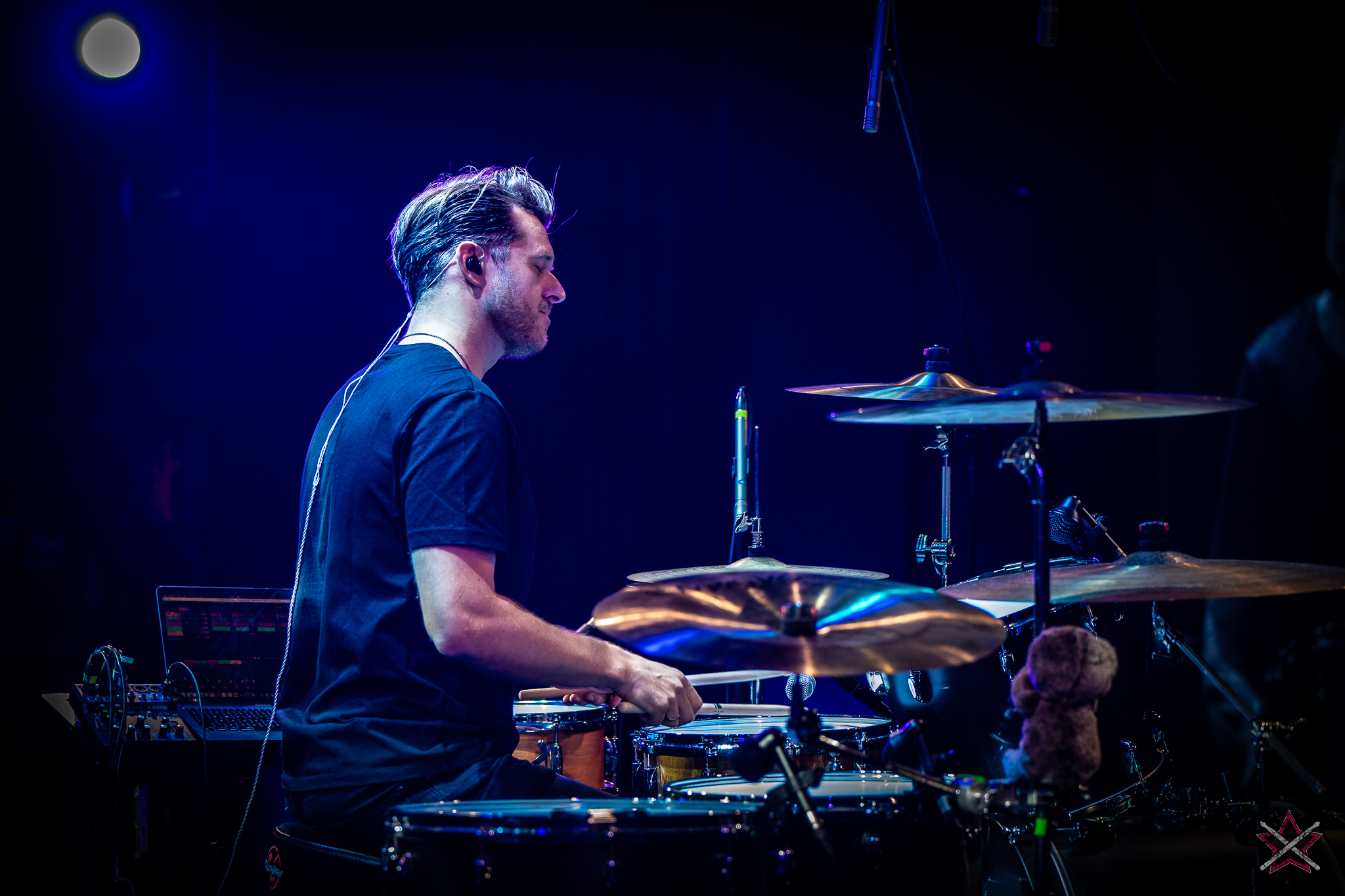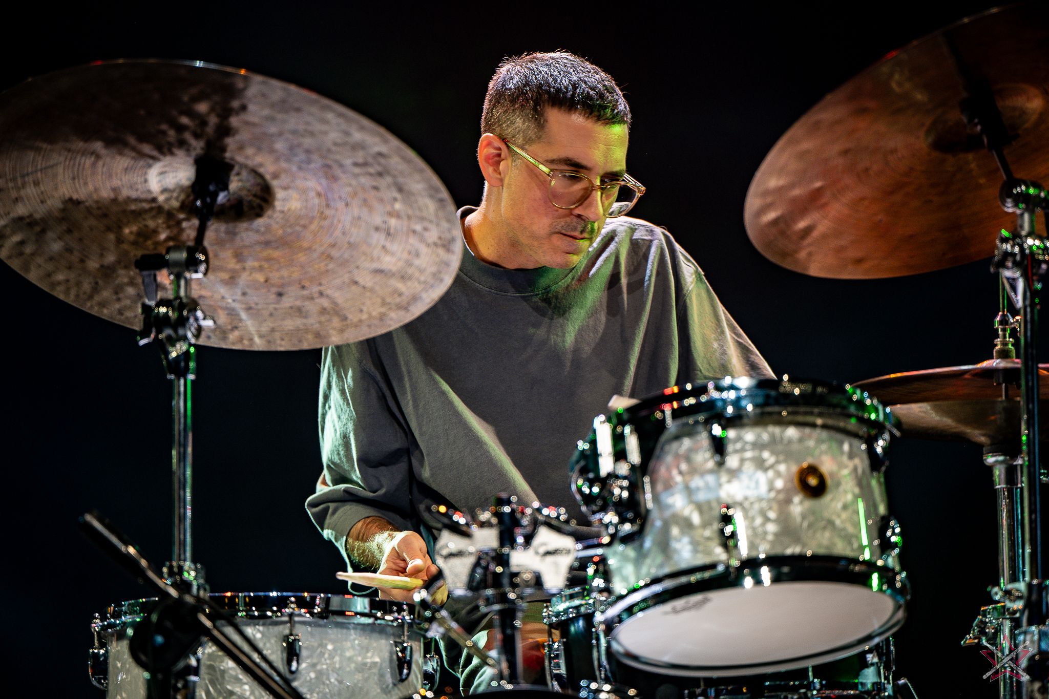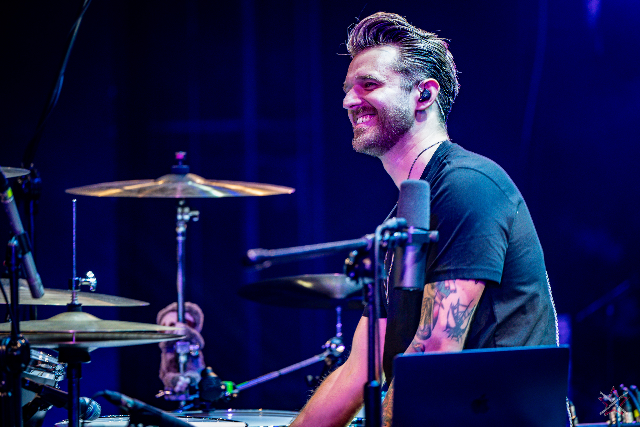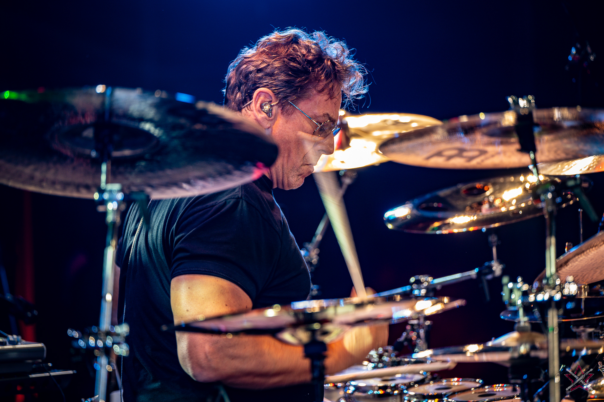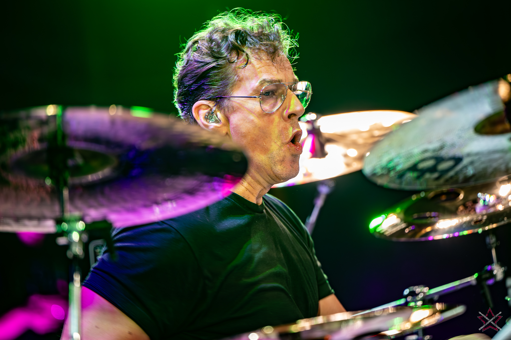 to już prawdziwa gwiazda w świecie bębnów. Dało się odczuć, że jest jedną z głównych atrakcji imprezy oraz że publiczność czekała na spotkanie z nim. Zaczął od hitu “Freestyler” Bomfunk MC’s sprzed 26 lat i była to jazda na najwyższych obrotach – pojawiły się elementy jungle, break beaty, a nawet blasty. Kolejny podkład był czysto metalowy, więc wystrzeliło jeszcze więcej blastów granych z obu stron (oburęczność włoskiego mistrza jest doskonale znana) oraz wybuchowych przejść po całym zestawie, nie zabrakło także precyzyjnej gry na dwie stopy. W improwizowanej części występu artysta dorzucił świetny moment gry open-handed i kolejny doskonały popis gry nogami. Na osobną wzmiankę zasługuje świetna prezentacja techniki rąk, jaką Riccardo przeprowadził w odpowiedzi na pytanie o to, jak doszedł do takiego tempa gry. W jasny i spójny sposób opisał i pokazał, na czym to polega, bez owijania w bawełnę po to, aby zazdrośnie “strzec” swojej “tajemnicy”. Przecież i tak każdy musi, nomen omen, odbębnić swoje przysłowiowe 10 tys. godzin 😉