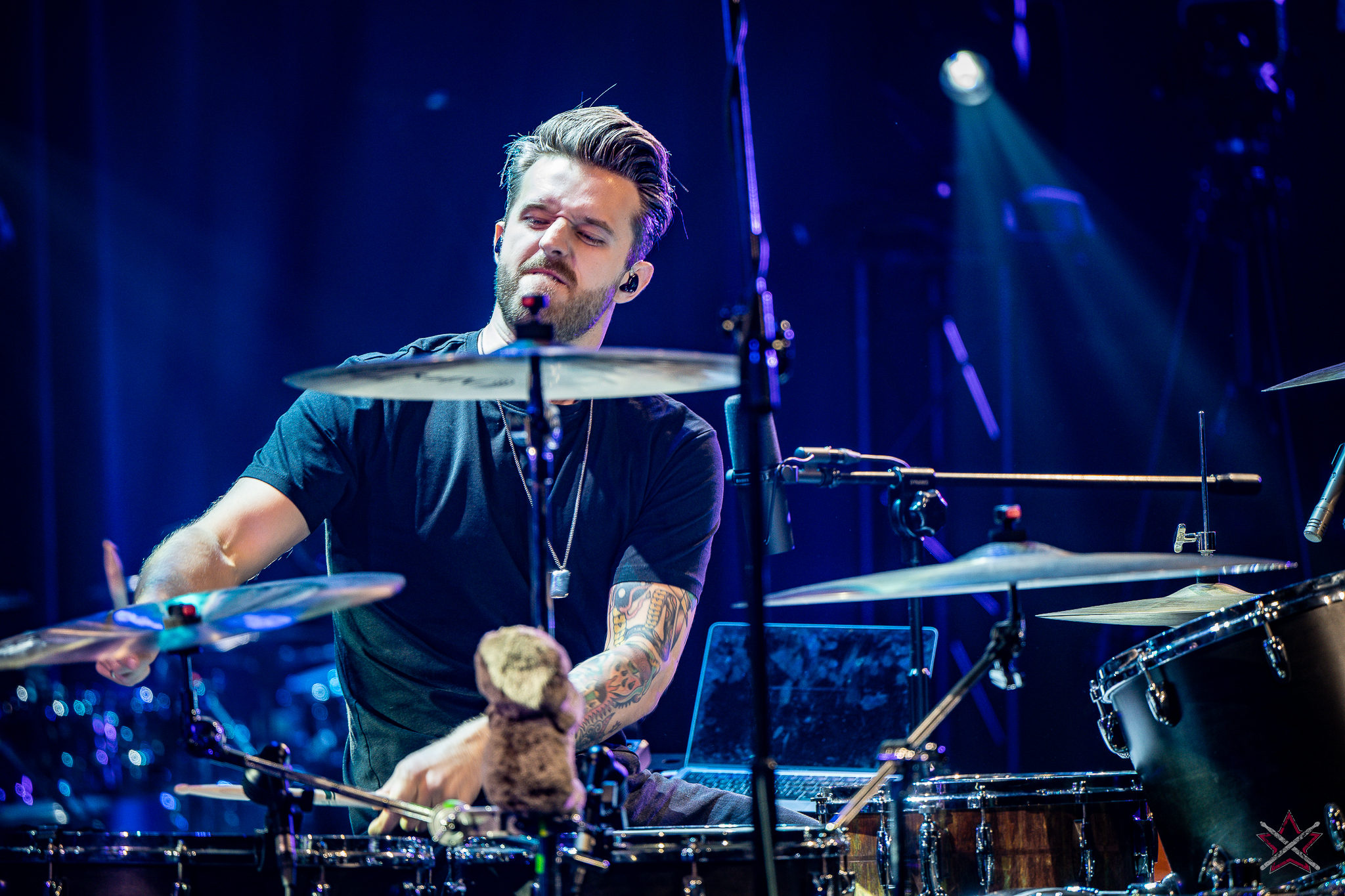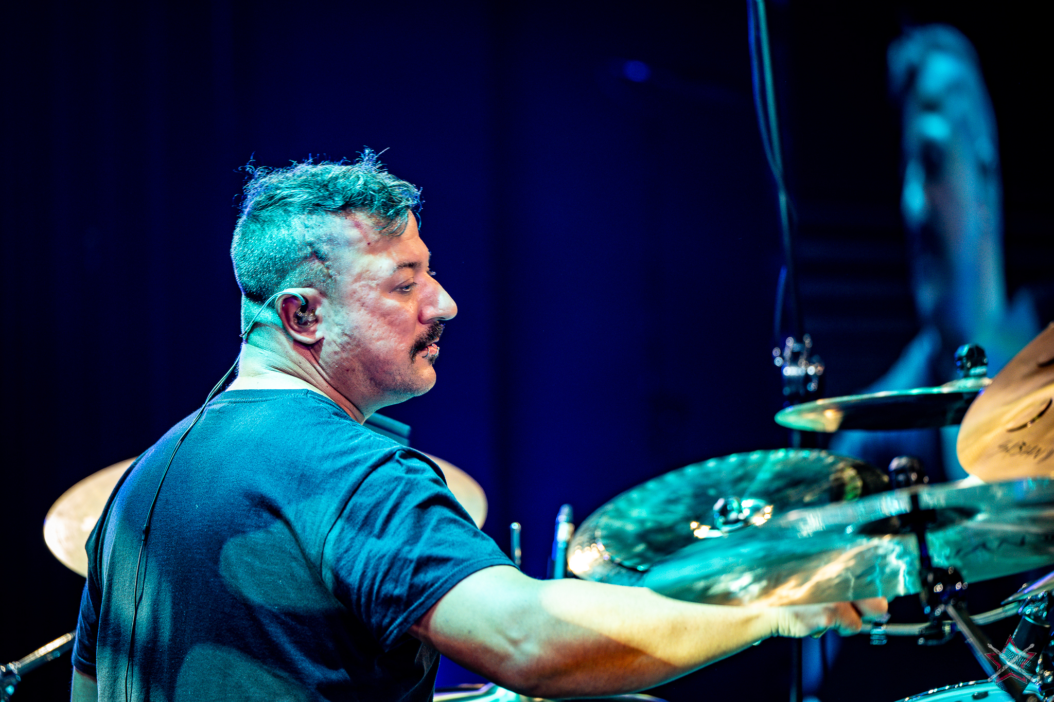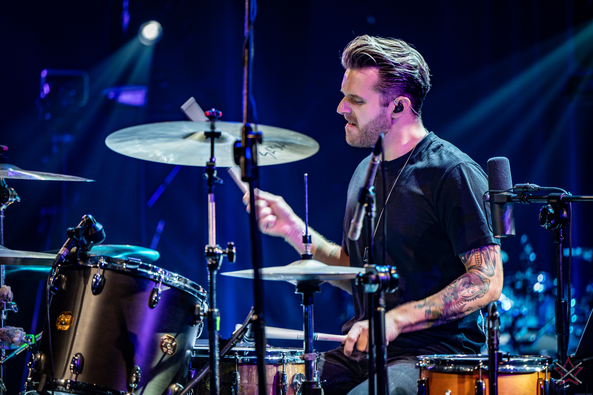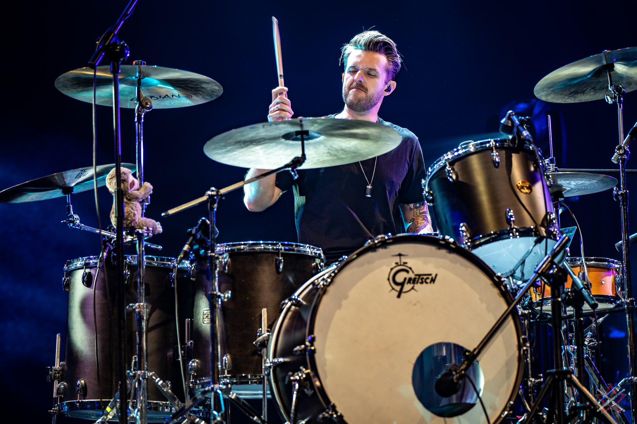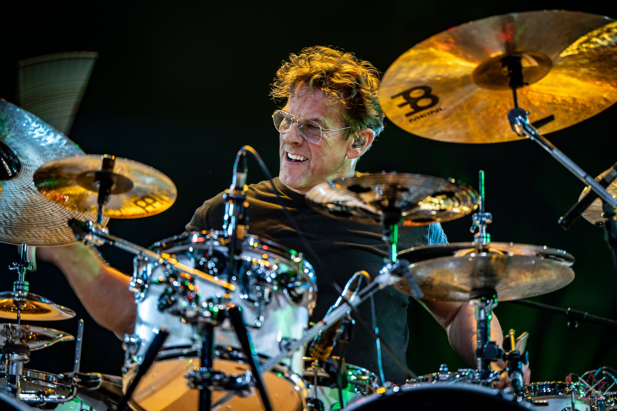 to już prawdziwa gwiazda w świecie bębnów. Dało się odczuć, że jest jedną z głównych atrakcji imprezy oraz że publiczność czekała na spotkanie z nim. Zaczął od hitu “Freestyler” Bomfunk MC’s sprzed 26 lat i była to jazda na najwyższych obrotach – pojawiły się elementy jungle, break beaty, a nawet blasty. Kolejny podkład był czysto metalowy, więc wystrzeliło jeszcze więcej blastów granych z obu stron (oburęczność włoskiego mistrza jest doskonale znana) oraz wybuchowych przejść po całym zestawie, nie zabrakło także precyzyjnej gry na dwie stopy. W improwizowanej części występu artysta dorzucił świetny moment gry open-handed i kolejny doskonały popis gry nogami. Na osobną wzmiankę zasługuje świetna prezentacja techniki rąk, jaką Riccardo przeprowadził w odpowiedzi na pytanie o to, jak doszedł do takiego tempa gry. W jasny i spójny sposób opisał i pokazał, na czym to polega, bez owijania w bawełnę po to, aby zazdrośnie “strzec” swojej “tajemnicy”. Przecież i tak każdy musi, nomen omen, odbębnić swoje przysłowiowe 10 tys. godzin 😉