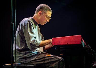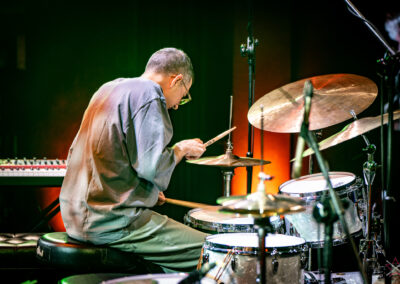 to już instytucja wśród perkusistów pracujących na własny rachunek, bez przydziału zespołowego. Jego pokaz był prawdziwym gejzerem energii (a gość dobija do 60-tki) – pomysłowe rytmy stanowiące kompozycje same w sobie, oburęczność i obunożność (naliczyliśmy sześć pedałów, na których jego nogi “tańczyły” bez chwili odpoczynku) w służbie polirytmii, kreatywne wykorzystanie rata tomów (rodzaj drewnianych octobanów od DW), a do tego groove i cios. Swoje solo austriacki mistrz zaczął od, będących jednym z jego znaków rozpoznawczych, Stix Trix (sztuczek z pałeczkami w stylu Buddy Richa) – najpierw na hi-hacie, potem na pozostałych blachach oraz obręczach bębnów, następnie w ruch poszły talerze uruchamiane pedałami (przy tej okazji świetny rytm w stylu Latino grany nogami na cztery pedały po lewej i dwa po prawej stronie). Owacja na stojąco pokazała dobitnie, kto był gwiazdą wieczoru. Ostatni utwór zawierał znacznie prostszą partię bębnów, co dało więcej miejsca na fajny groove i stanowiło doskonałe odświeżenie na ostatniej prostej. Doskonale skonstruowany występ od strony dramaturgicznej w połączeniu z bezbłędnym wykonawstwem.