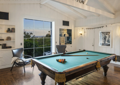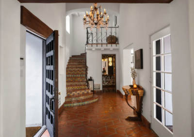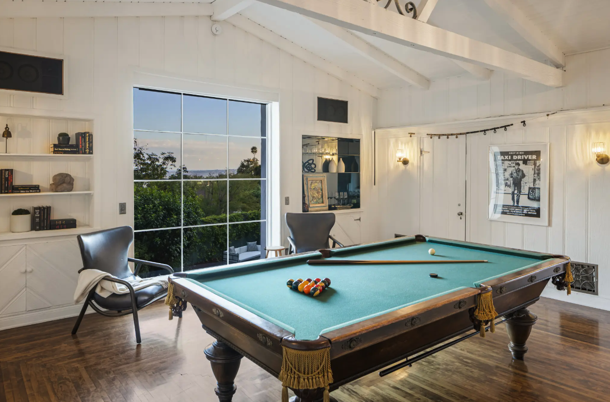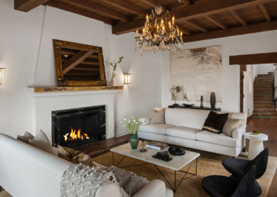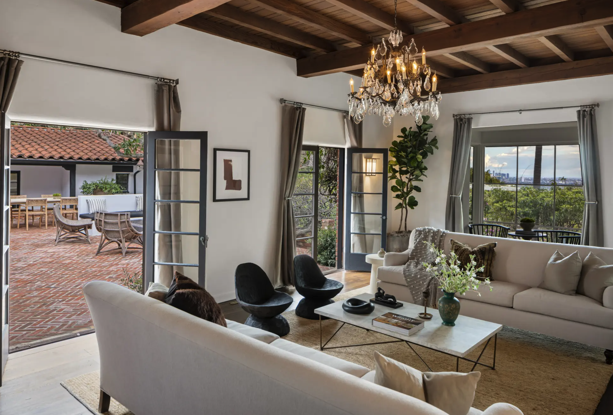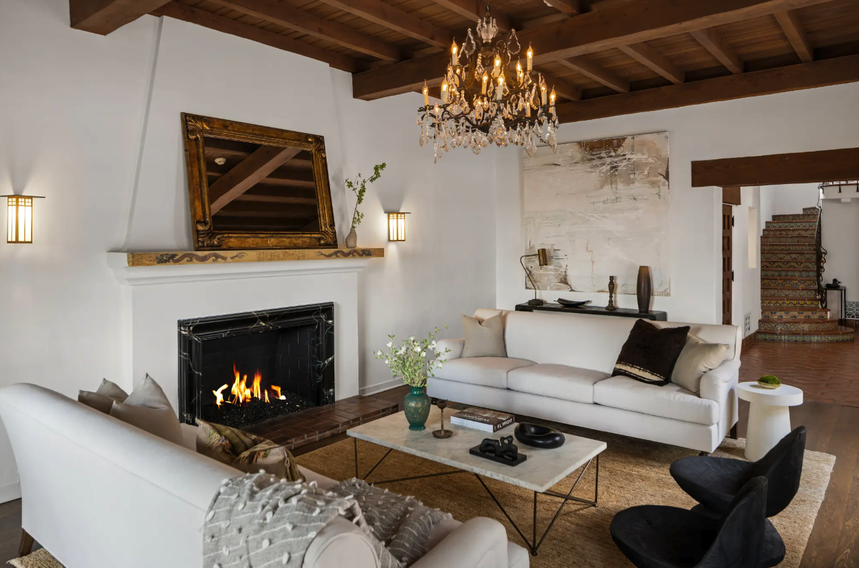 Rezydencja zachwyca wysokimi sufitami i ozdobnymi schodami wyłożonymi kafelkami. W eleganckim salonie możemy podziwiać sklepione sufity, duże okno, drewniane podłogi i kominek z czarnego marmuru. Jest nawet przypominająca chatę jaskinia z kamiennym kominkiem, szafą na wino i belkami stropowymi.