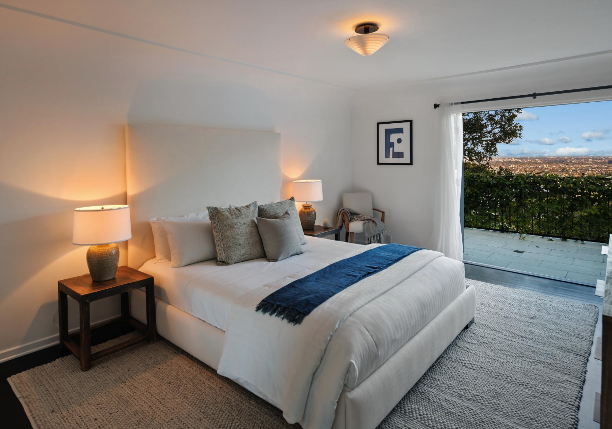 Na piętrze znajdują się główna sypialnia i łazienka przypominająca spa, zachwyt budzi też balkon z widokiem na patio i piękny krajobraz.