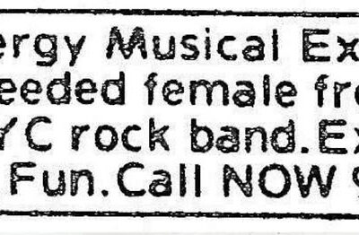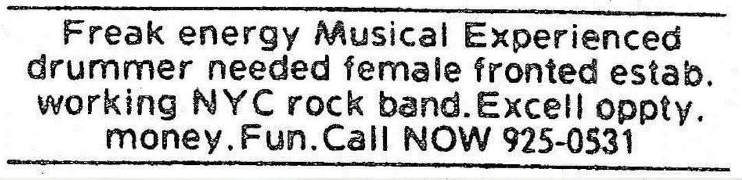 Ogłoszenie w gazecie Village Voice, na które odpowiedział Clem Burke (połowa marca 1975 r.)