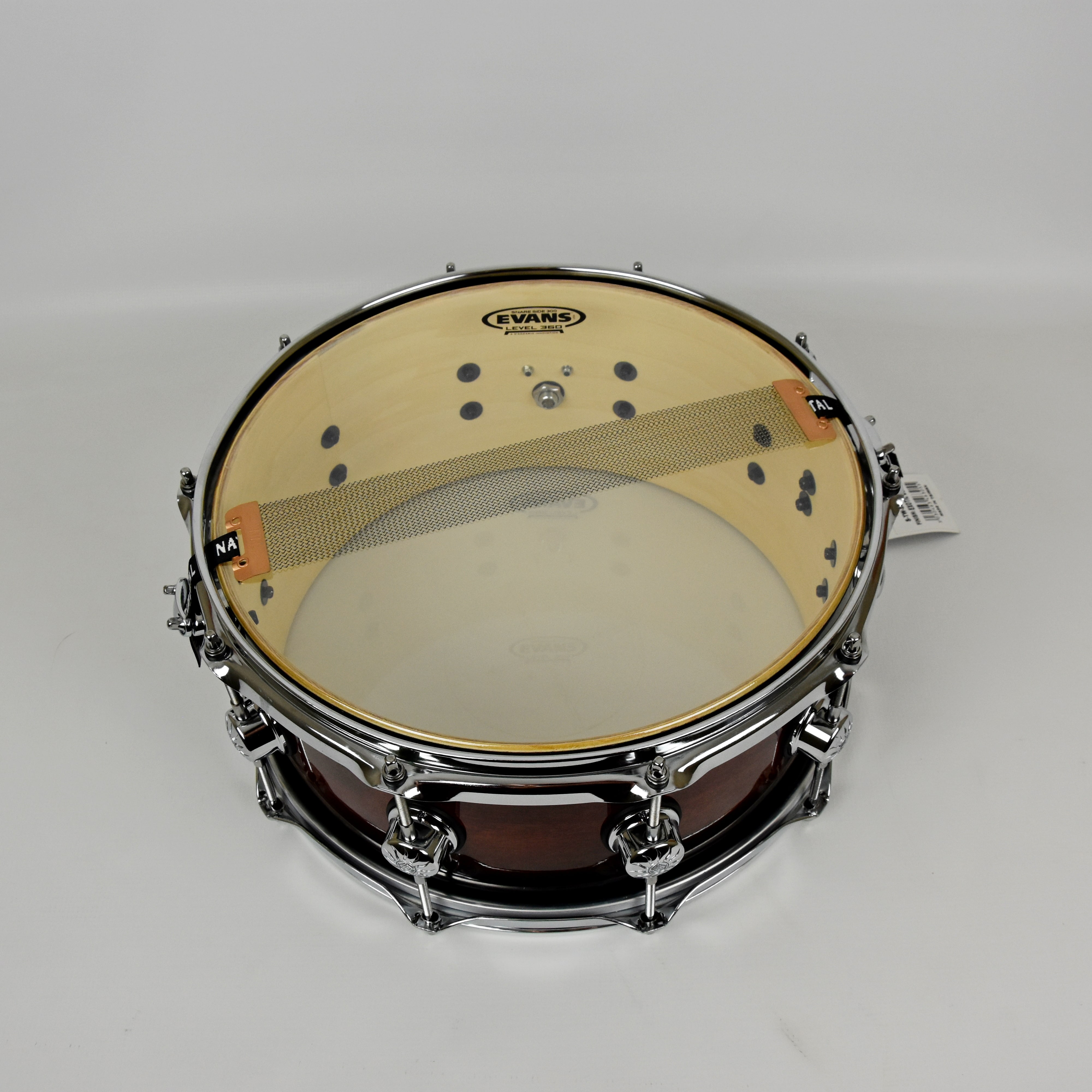 Werbel Natal Cafe Racer Exotic to, jak już pisaliśmy, przepiękny instrument. Wyposażony w świetnie działającą maszynkę Tri-Throw oraz solidne lugi typu Triple-Flanged bęben potrafi wydobyć z siebie bardzo dostojne brzmienie. Jest również nieco ciężki, co oznacza, że nie będzie “huśtał” się na statywie. Takie połączenie zapewnia konkretne narzędzie pracy dla perkusistów, którzy lubią ciepłe, skupione brzmienia zapewnione przez drewno tulipanowca. Pokochają go zarówno rockmani, jak i bębniarze grający funk/r’n’b czy fusion. Werbel trzyma strój, dlatego osoby grające nieco mocniej mogą być spokojne o ton nawet podczas najdłuższych setów. Duszki wygrywane na tym werblu, szczególnie w średnim stroju brzmią po prostu pięknie. W wyposażeniu podstawowym otrzymujemy naciągi Evans 360 oraz mocną, 20- strunową sprężynę firmy Natal. Jesteśmy pod dużym wrażeniem!