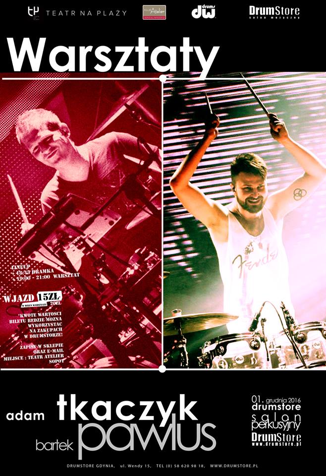Rosnący w siłę duet edukacyjny- Adam Tkaczyk (Kombii) oraz Bartek Pawlus (Bracia) wystąpi dla Was, oraz poprowadzi warsztaty już 1.12.2016 o godz. 19:00 w Teatrze na plaży w Gdyni. Adam i Bartek poprowadzą te warsztaty wspólnie. Tematem przewodnim warsztatów będzie “życie w trasie”, czyli jak się odnaleźć w świecie polskiego show businessu. Całość okraszona będzie epickimi solówkami, anegdotami i tradycyjnym 100 pytaniami do… Co więcej, zdradzili iż przygotowali ciekawy materiał na dwa zestawy perkusyjne. Dodatkowo do waszego użytku będzie Klub Atelier z całym zapleczem barowym i socjalnym.