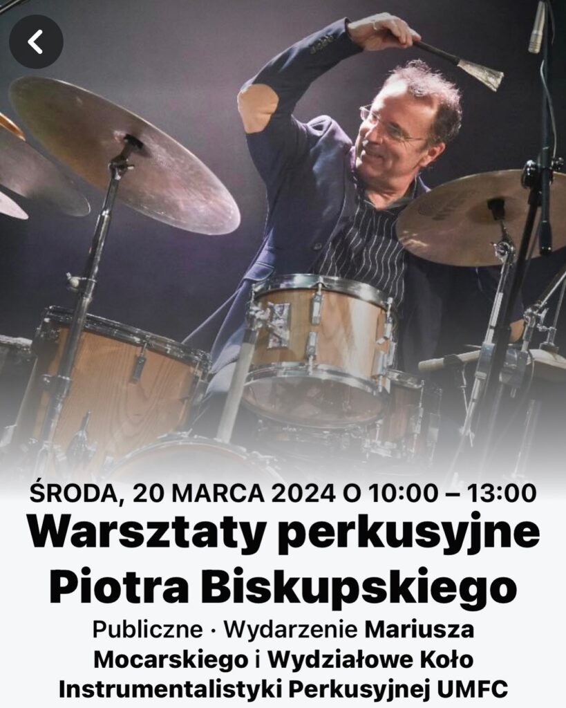 Wydziałowe Koło Instrumentalistyki Perkusyjnej Uniwersytetu Muzycznego Fryderyka Chopina Filii w Białymstoku oraz Mariusz Mocarski organizują na warsztaty perkusyjne, które poprowadzi prof. Piotr Biskupski.