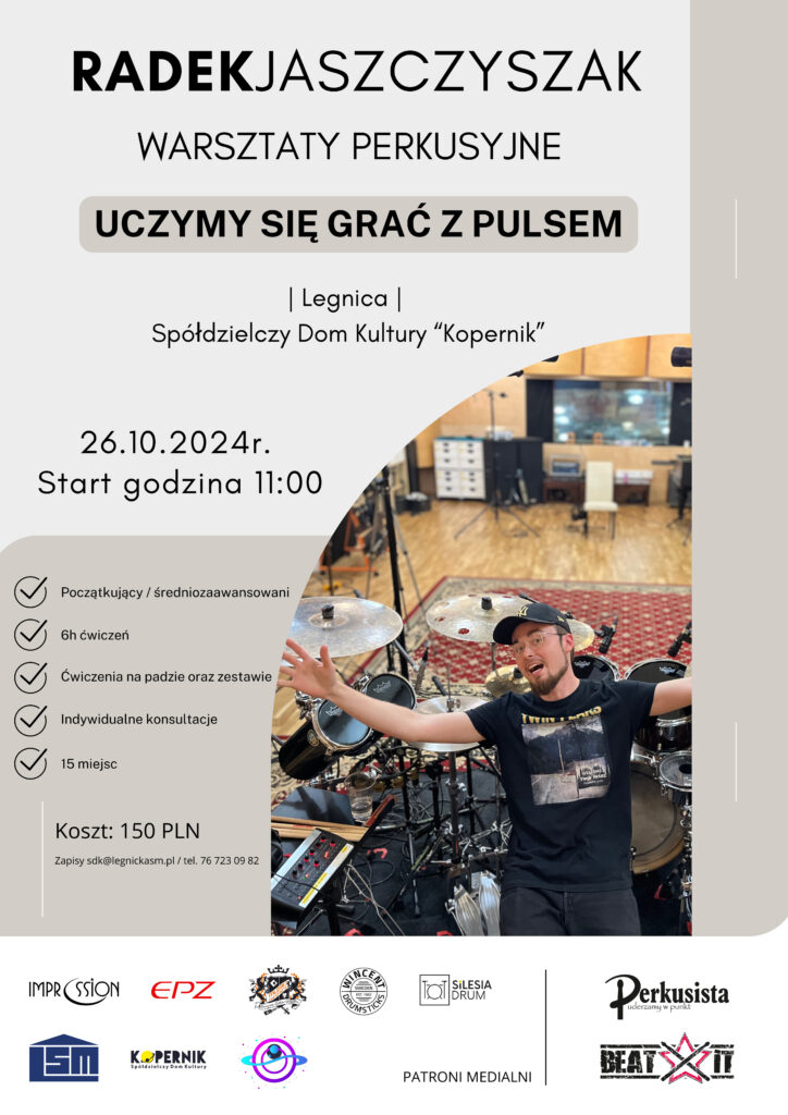 26 października br. w legnickim Spółdzielczym Domu Kultury „Kopernik” odbędą się warsztaty perkusyjne pod hasłem “Uczymy się grać z pulsem“, które poprowadzi perkusista, muzyk sesyjny, edukator, twórca cyfrowy – Radek Jaszczyszak.