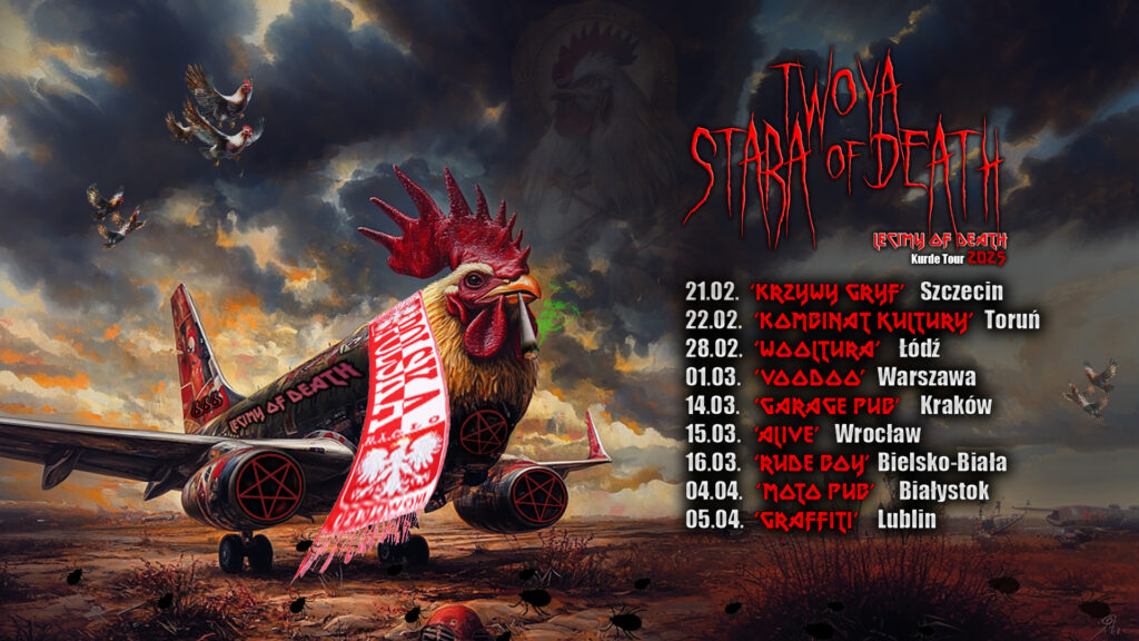 Grudniowe koncerty zespołu okazały się udanym wstępem do trasy. W odpowiedzi na super szybki, kurde, sold out w Warszawie, zespół Pana Cziken Emperora postanowił rozpieścić fanów i już niebawem Twoyastara Of Death pojawi się, kurde, w kolejnych miastach. Wiosna to 9 koncertów, 9 niezapomnianych wydarzeń, 9 nieprzespanych nocy. Fani thrash metalowego, kurde, grania wypełnionego czarnym humorem z pewnością nie będą zawiedzeni.